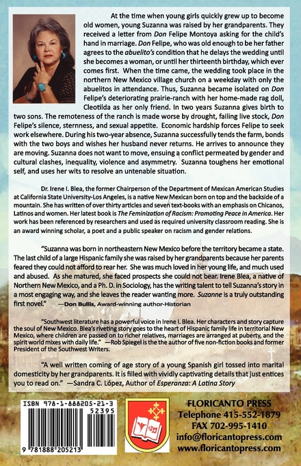 Suzanna. By Irene I. Blea. ISBN: 978-1-888205-21-3 $23.95 When young girls quickly grew up to be old women, young Suzanna was raised by her grandparents who received a letter from Don Felipe Montoya asking for the child's hand in marriage. Don Felipe is old enough to be her father. He agrees to the abuelito's condition that he delay obtaining Suzanna as a wife until she becomes a woman, or until her thirteenth birthday, which ever comes first. The wedding takes place in the northern New Mexico village church on a weekday with only the necessary parties in attendance. Thus, Suzanna becomes isolated on Don Felipe's failing prairie ranch with her home-made rag doll, Cleotilda as her only friend. In two years Suzanna gives birth to two sons. The remoteness of the ranch is made worse by drought, failing live stock, Don Felipe's silence, his sternness, and sexual appetite. Economic hardship forces Felipe to seek work elsewhere. He migrates north securing employment on a Wyoming sheep ranch. The experience strips Don Felipe of his title and he is now simply Felipe. During his two-year absence, Suzanna successfully tends the farm, bonds with the two boys and wishes her husband never return. He arrives to announce they are moving to Colorado where he will work in a steel mill. Suzanna and does not want to move. Felipe beats her badly into relocating. Her grandfather sooths her bruises and agrees she must go with her husband. Suzanne was born in northeastern New Mexico before the territory became a state. "The last child of a large Hispanic family she was raised by her grandparents because her parents feared they could not afford to rear her. She was much loved in her young life, and much used and abused. As she matured, she faced prospects she could not bear. Irene Blea, a native of Northern New Mexico, and a Ph. D. in Sociology, has the writing talent to tell Suzanne's story in a most engaging way, and she leaves the reader wanting more. Suzanne is a truly outstanding first novel."--Don Bullis, Author-Historian "A well written coming of age story of a young Spanish girl tossed into marital domesticity by her grandparents. It is filled with vividly captivating details that just entices you to read on." --Sandra C. Lopez, Author of Esperanza: A Latina Story